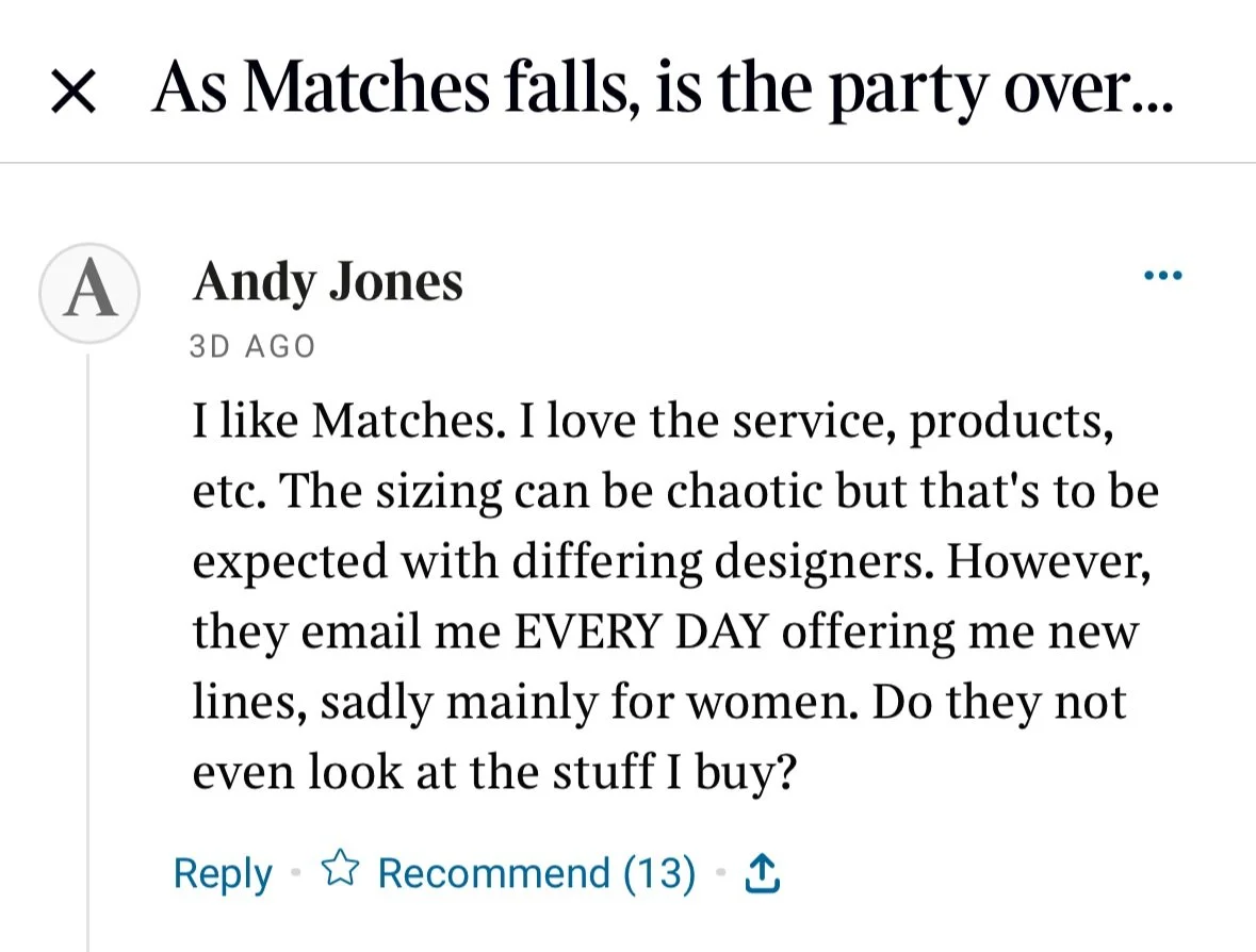Personalisation is Matches’ raison d'etre and how they started out in Wimbledon. When they launched their website in 2006 the growth challenge was to take this core competency into the digital world. Fast forward to today and it is a very obvious application of data science and table stakes given that brands are fighting back with direct to consumer (DTC). It appears even back in 2019 Matches were making good progress in recommendation engines. There is an amusing difference between the alleged sophistication of recommendation models versus the daily frustrations we seem to face as consumers. The below comment about Matchesfashion, taken from a mainstream newspaper just the other day, seems to indicate that I am not alone in my thinking. Your recommendation engine is only as good as the channel execution allows it to be.